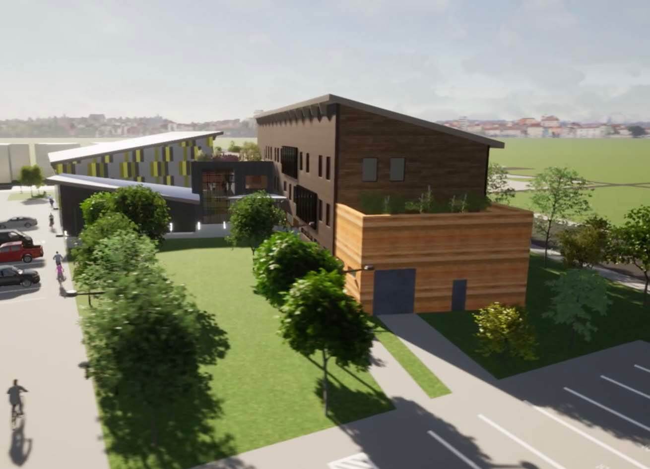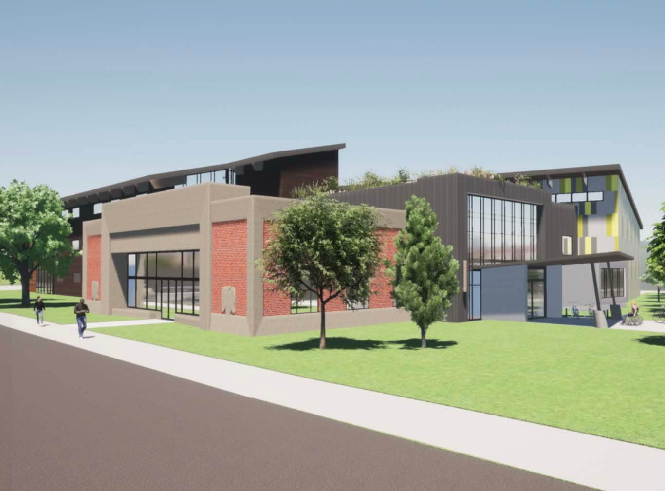 The Community Impact Center was planned at 36,000 square feet—3,300 of it in the restored bank building, and 32,000 in new timber construction. The spaces reflected what community members asked for: a gym, theatre, community rooms, commercial kitchen, podcast/recording studio, e-sports lab, art studios, a medical clinic and counseling rooms.